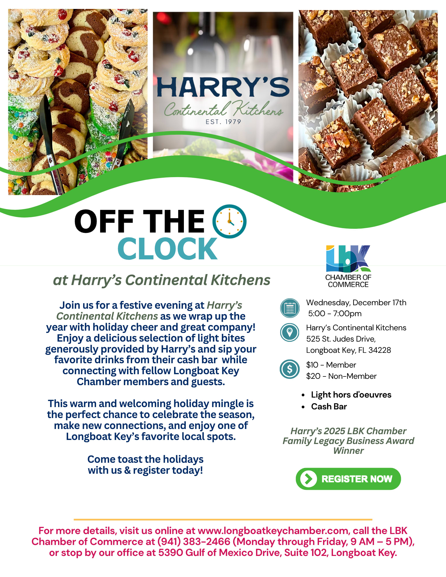 Join us for a festive evening at Harry’s Continental Kitchens as we wrap up the year with holiday cheer and great company! 🎄✨ Enjoy a delicious selection of light bites generously provided by Harry’s 🍽️ and sip your favorite drinks from their cash bar 🍹 while connecting with fellow Longboat Key Chamber members and guests.