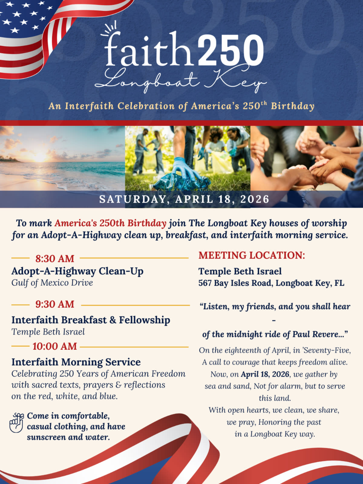 An interfaith celebration of America's 250th birthday! Join the Longboat Key houses of worship for an Adopt-a Highway Clean-up, bagel breakfast and interfaith morning service.Images
