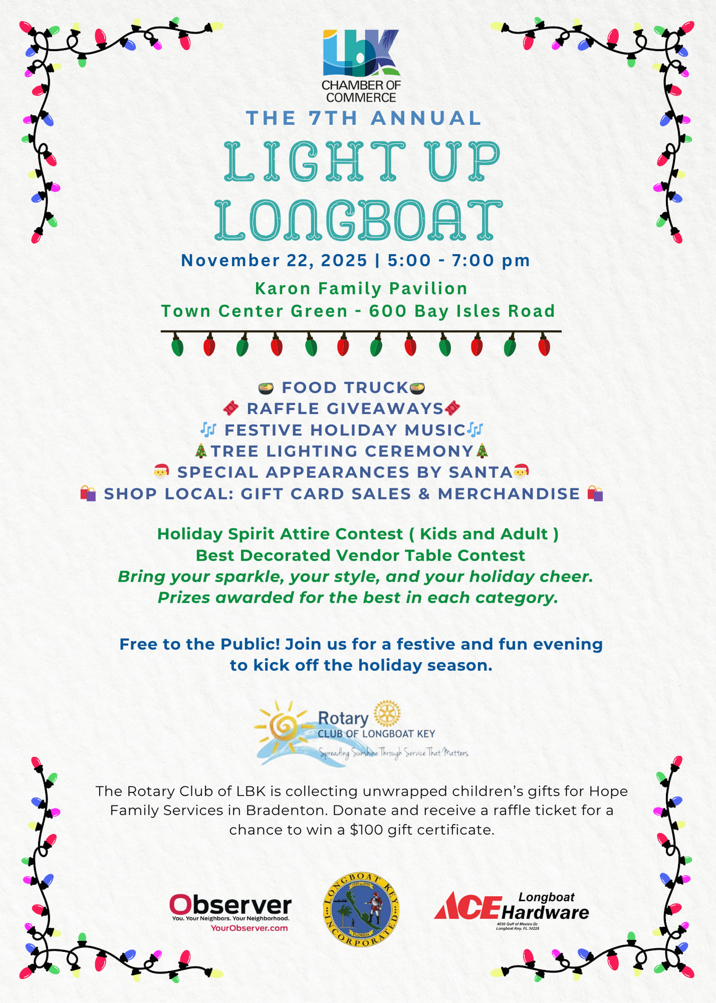 Kick off the holiday season with the Longboat Key Chamber of Commerce at the 7th Annual Light Up Longboat — a cheerful community celebration filled with festive fun for all ages!