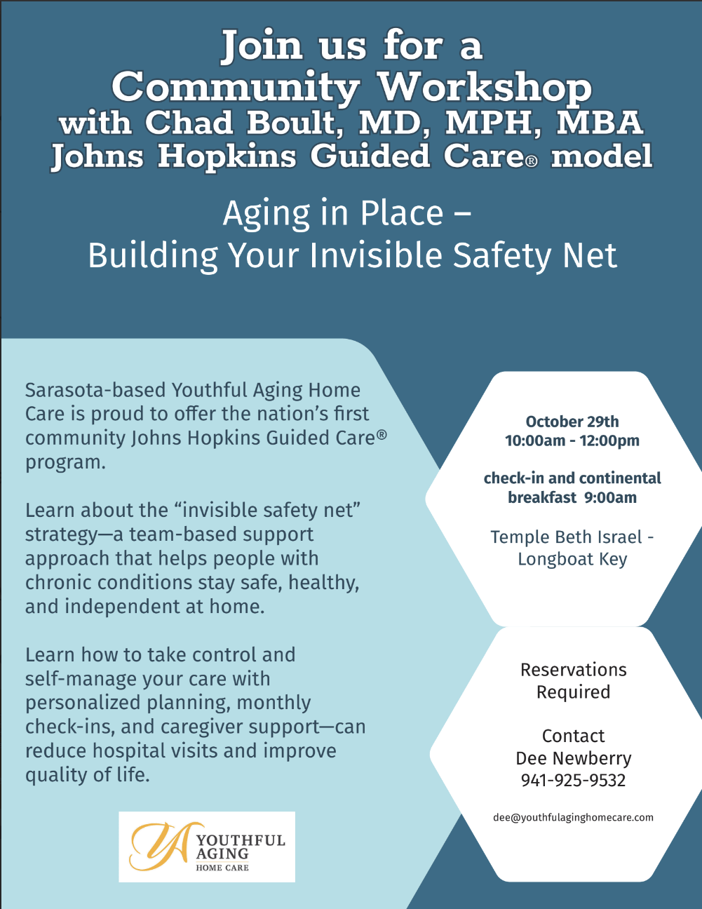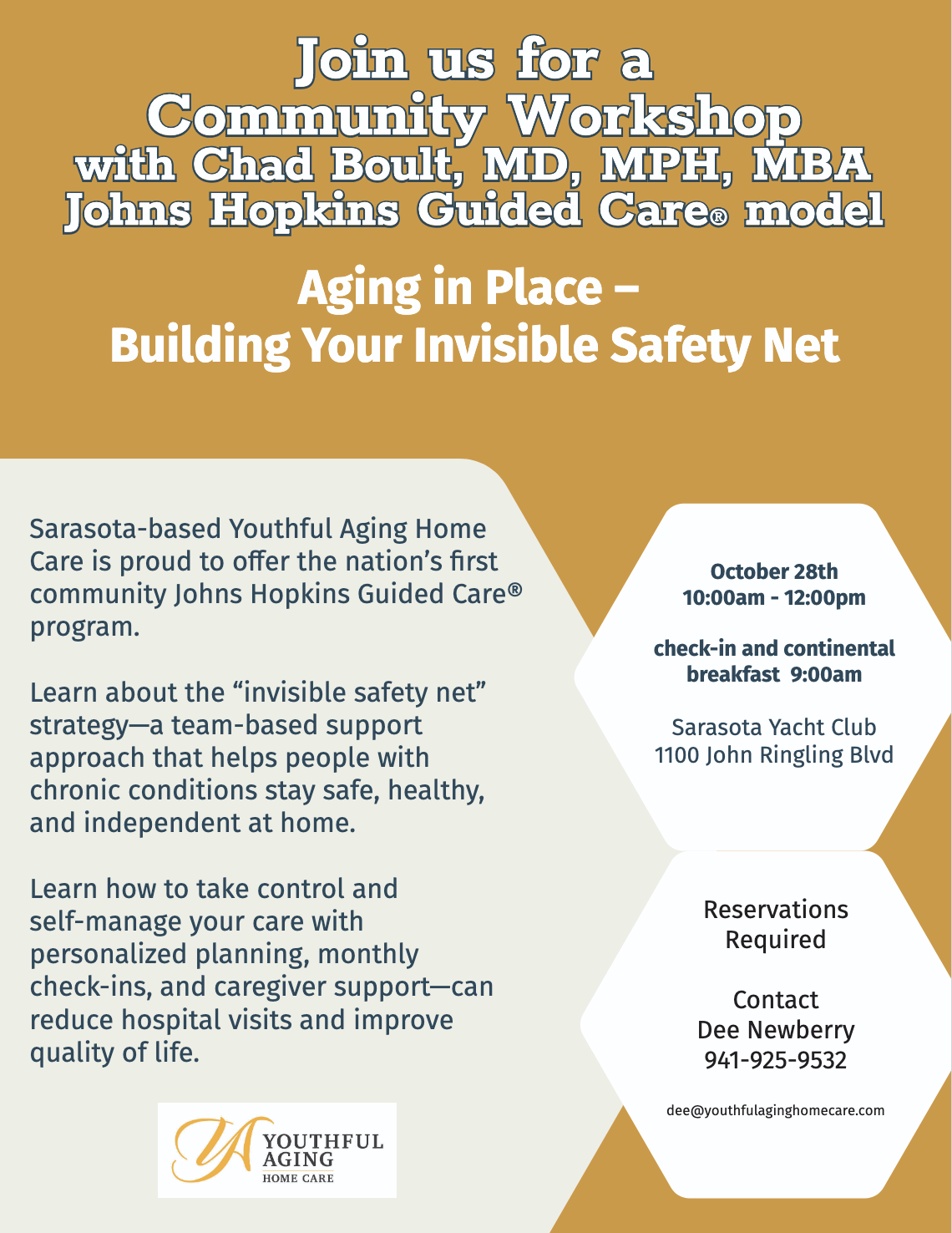 Join us for a special community workshop featuring Chad Boult, MD, MPH, MBA, presenting the nationally recognized Johns Hopkins Guided Care® model. Hosted by Sarasota-based Youthful Aging Home Care, this event explores practical strategies that help individuals with chronic conditions remain safe, healthy, and independent at home.