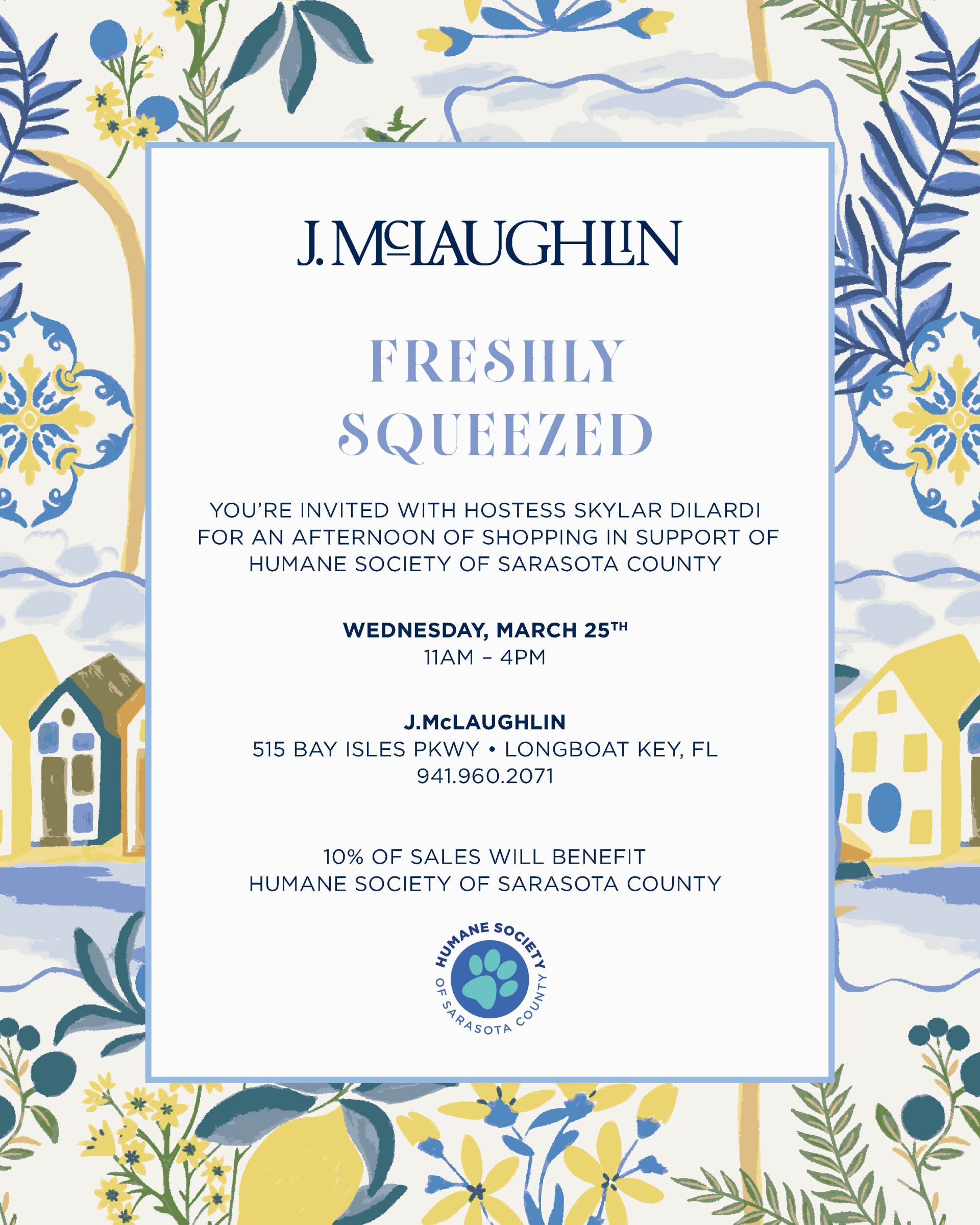 You're invited for an afternoon of shopping at J. McLaughlin in support of the Humane Society of Sarasota County. Skylar Dilardi will be your hostess for this event.Images