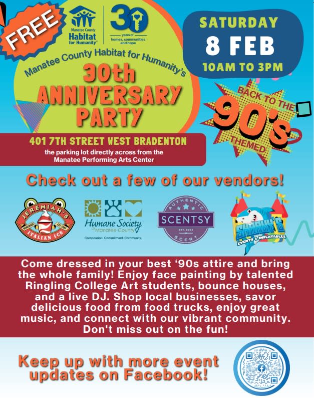 We’re thrilled to invite you to celebrate our 30 years of service to the community with a FREE 30th Anniversary Party, and it’s '90s themed! Join us on Saturday, February 8th, at the parking lot across from The Manatee Performing Arts Center (401 7th Street West, Bradenton) for a family fun celebration for all ages. Shop at local businesses, enjoy music, savor delicious food from food trucks, and connect with our vibrant community.
